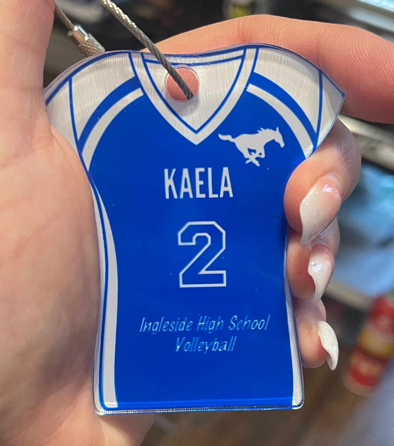 The example name "KAELA" is displayed above the large number "2," both of which are customizable to reflect the owner's name and preferred number. Below this, "Ingleside High School Volleyball" is printed, indicating the specific sport and institution the tag is representing, which can also be tailored to the customer's details.