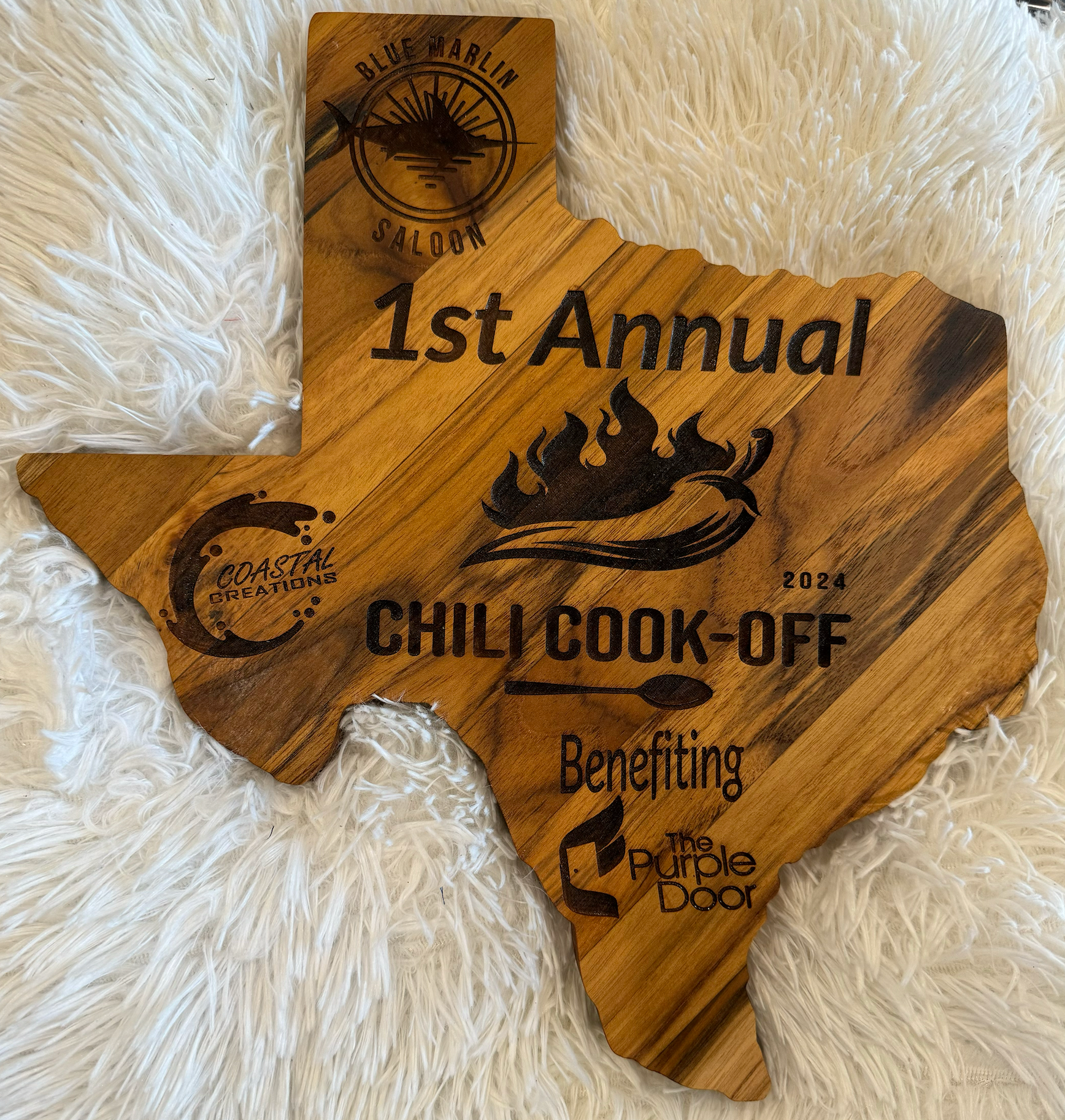 The displayed sample is a beautifully crafted board that commemorates the "1st Annual Chili Cook-Off 2024," benefiting The Purple Door organization. The top left features an etched logo of the Blue Marlin Saloon, and the bottom left corner showcases the logo of Coastal Creations.