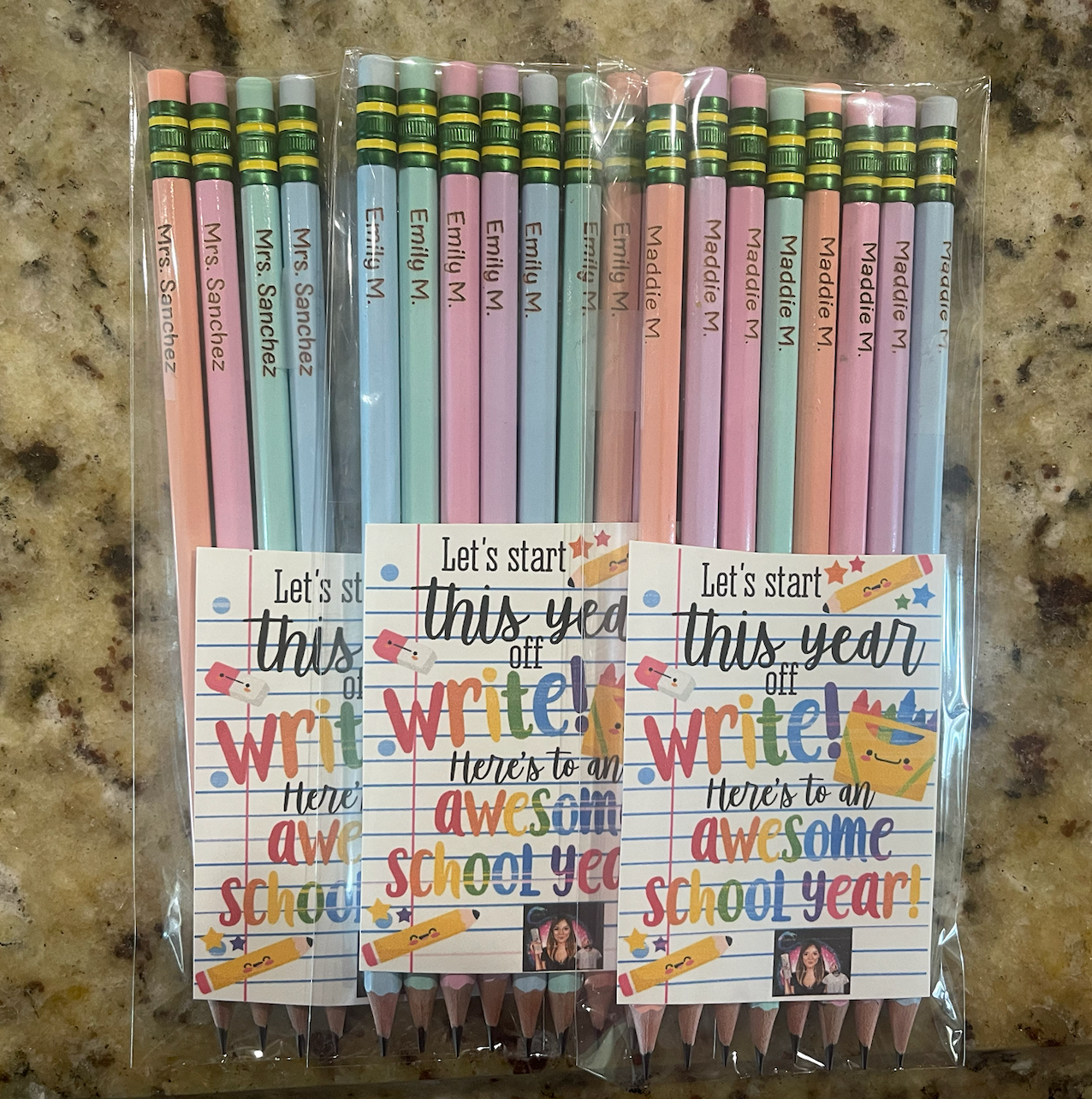 The design on the cards features whimsical graphics of pencils, emphasizing the joy of writing and creativity. Additionally, a photo can be seen in the lower corner of the cards, suggesting that there is space for a personal photo or message, which could be a lovely way for a teacher to introduce themselves to their students or a unique way to share special moments. Whether it's for back-to-school, teacher appreciation, or as a personal stationery set, these engraved pastel pencils are a charming and practical choice.