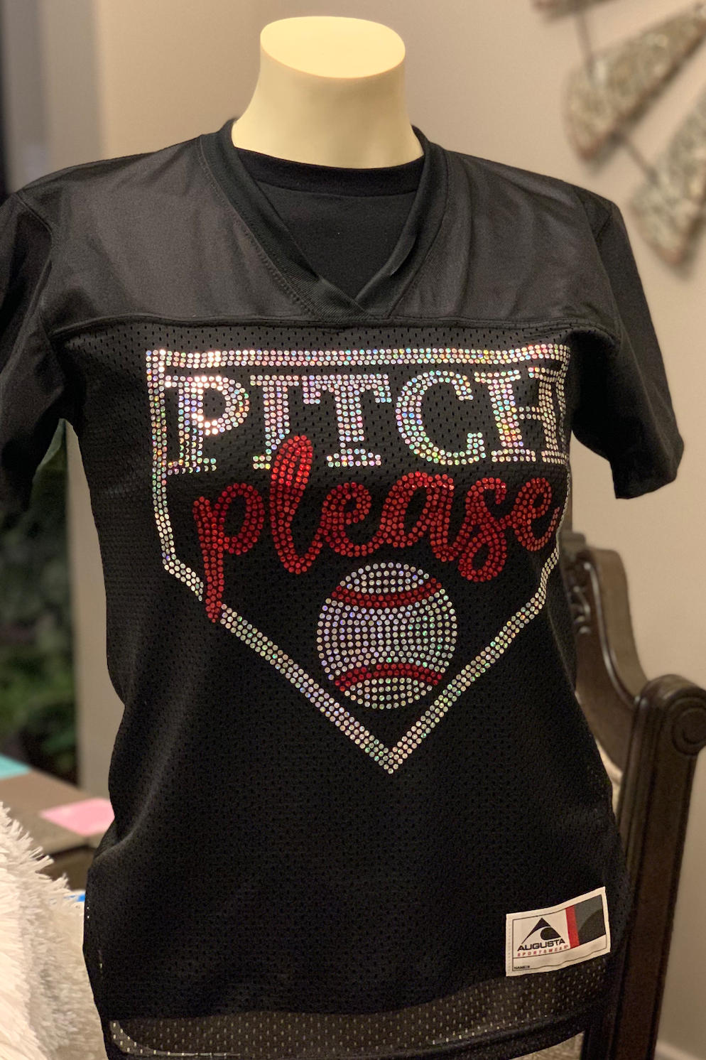 This custom bling shirt exudes attitude and style, perfect for making a bold statement. Crafted from a black mesh fabric that provides both a sporty look and breathable comfort, it features a dazzling design that captures the eye. The front of the shirt is adorned with the phrase "PITCH please" in a large, playful font, each letter encrusted with a sparkling array of rhinestones. The colors transition from a crisp white at the top, through a gradient of red and back to white, creating a visually striking effect.